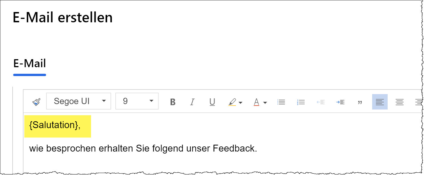Wenn sich eine dieser Variablen in einer E-Mail befindet und die E-Mail gespeichert wird, erstellt das CRM auf Basis des Empfängers automatisch die Anrede.